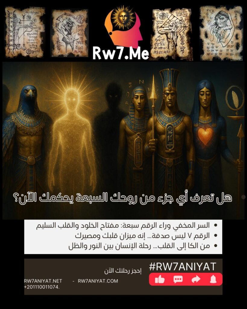 في الإسلام، نجد السبعة في كل ركن: سبع سماوات، سبع أبواب لجهنم، سبع آيات للفاتحة، والطواف سبعاً. السبعة هي رحلة الصعود من الأرض إلى السماء، ومن النفس إلى الحضرة الإلهية. لكن، لكي تفهم هذا الصعود، يجب أن تفهم مكونات الروح السبعة التي وضع أسسها المصري القديم لتكون دليلاً للوصول إلى “القلب السليم”.